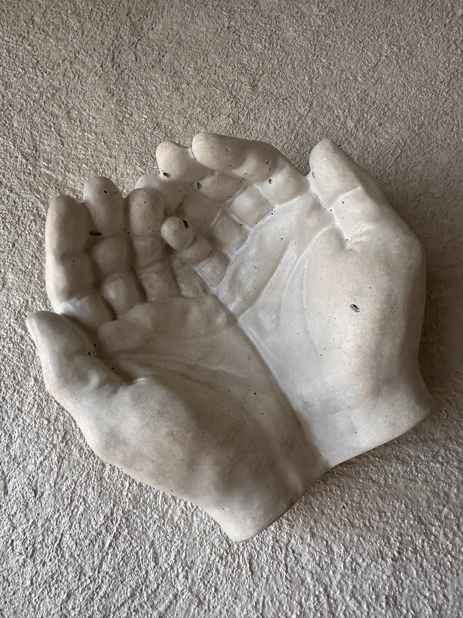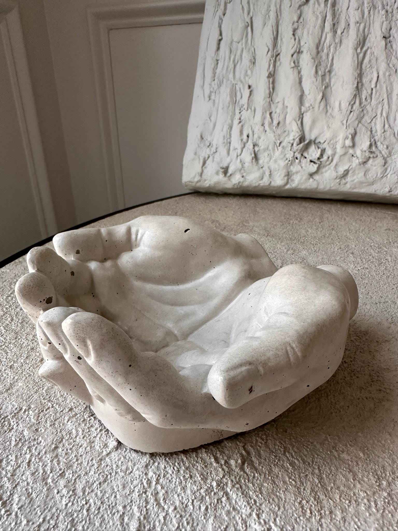 This unique handmade concrete bowl, shaped like a pair of open hands, is not only a stylish decor piece but also an eco-conscious choice. Crafted using a special mix of concrete and recycled cardboard, it embodies sustainability while maintaining a minimalist and artistic design.