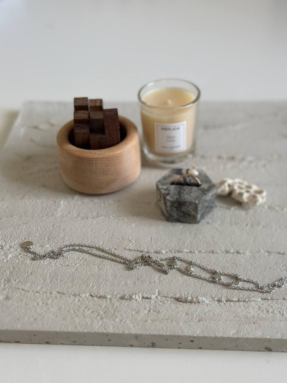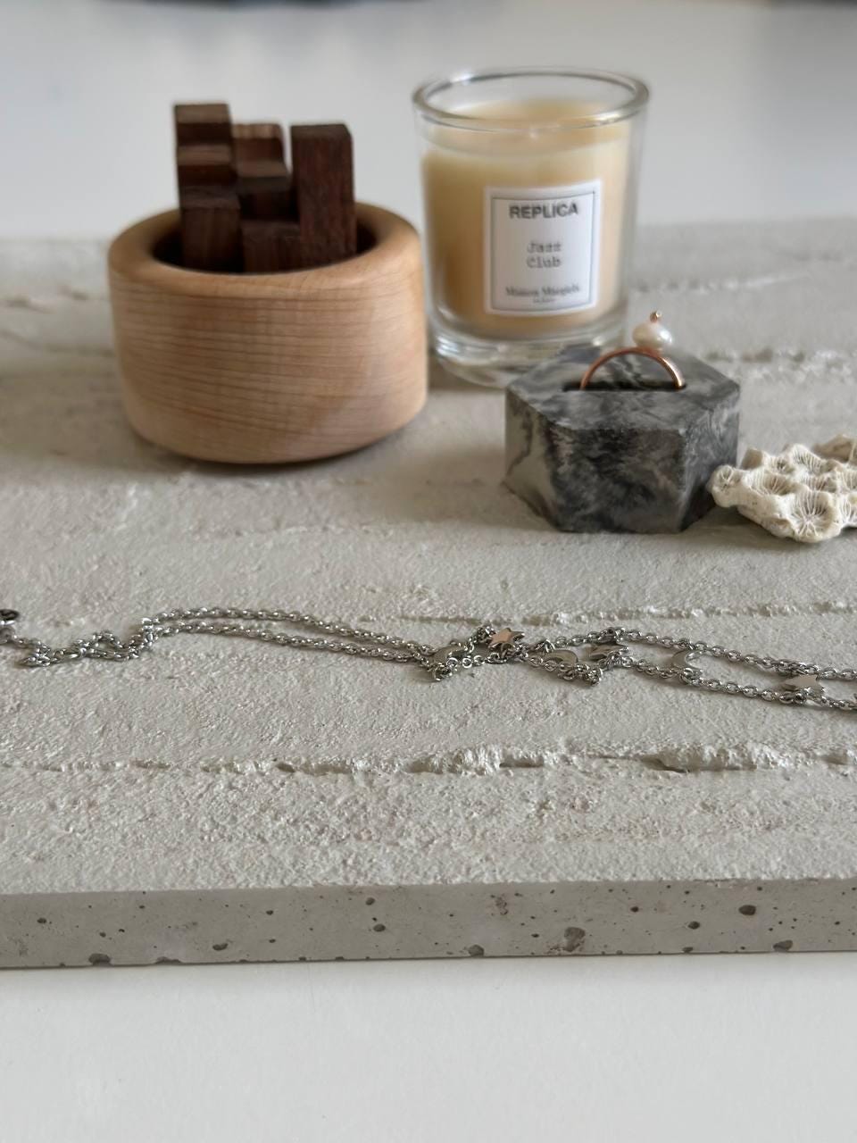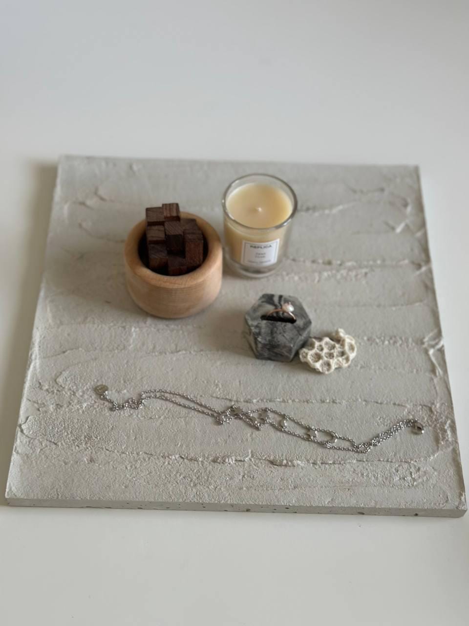This tray makes a stunning decor accent for your home or a thoughtful gift for lovers of natural aesthetics. Handcrafted with care, this concrete tray combines the beauty of natural materials with a modern minimalist design. Created in a soft gray marble tone, this tray is perfect for stylishly storing your accessories, jewelry, or candles. Its unique concrete & paper clay texture adds a touch of elegance, while the smooth surface beautifully contrasts with the textured, sculptural base.