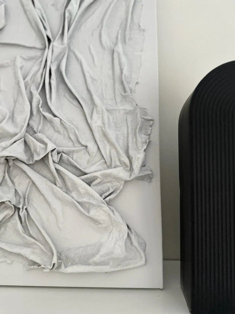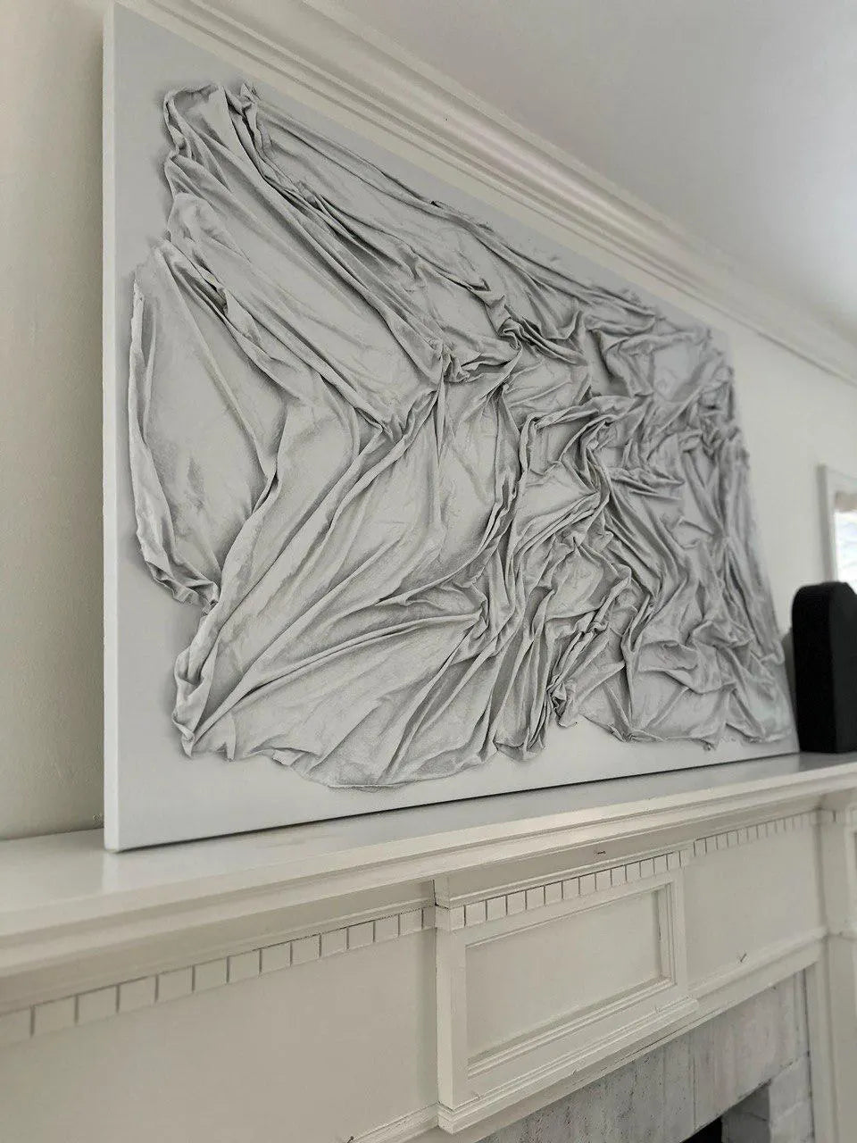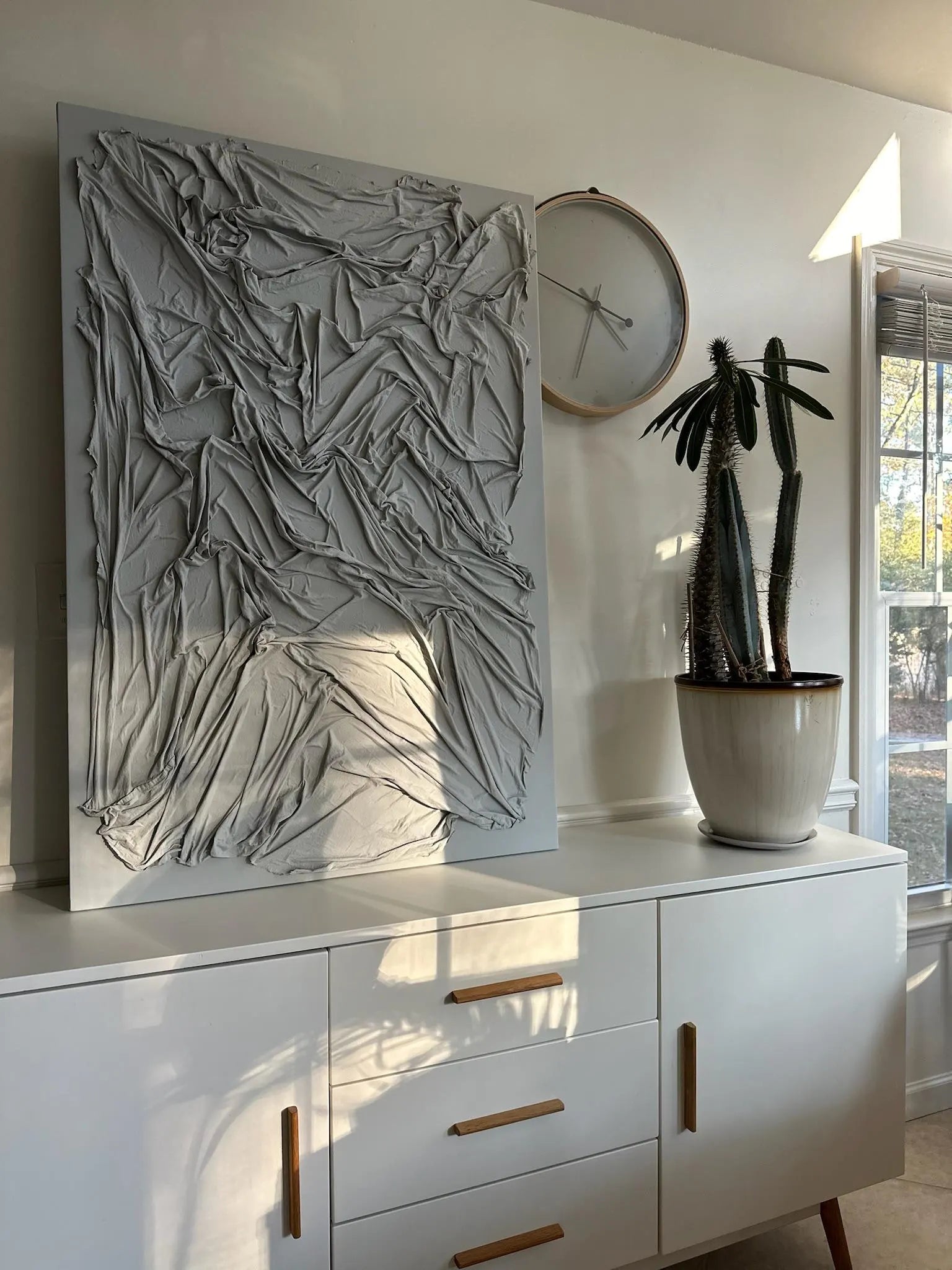 This sophisticated textured artwork is the perfect accent for modern interiors. Handcrafted using fabric, a special fixing mixture, and high-quality paint, it brings depth and dimension to any space.